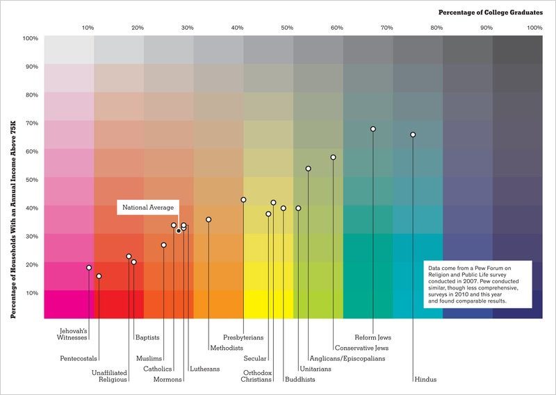 Au bas de l’échelle, on trouve les pentecôtistes, les témoins de Jehova et les baptistes. Aucun de ces groupes ne dépasse 20% des ménages affiliés gagnant davantage de 75000 dollars.