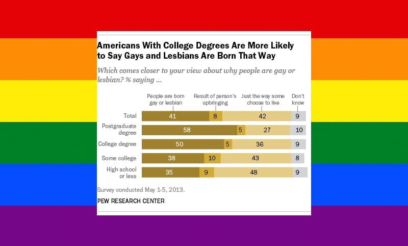 Selon l’étude, les personnes des milieux intellectuels sont plus favorables à l’idée d’une homosexualité naturelle. En 1985, 20% des Américains pensaient que certains «sont nés homosexuels».