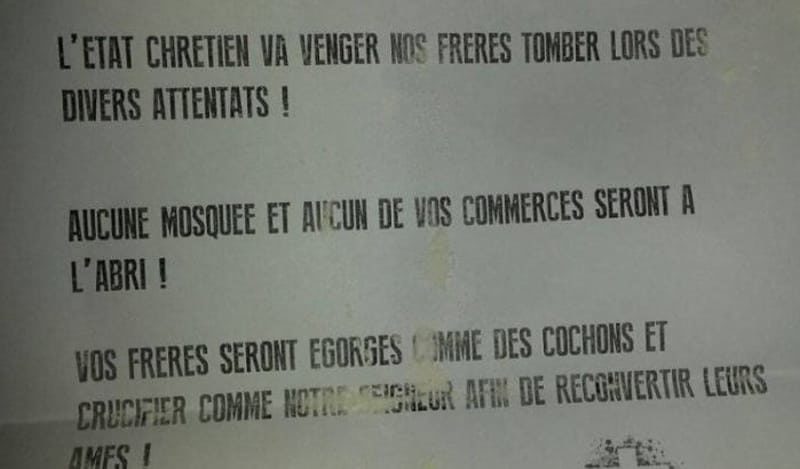 Trois mosquées belges ont reçu des lettres de menaces signées «l’Etat chrétien» depuis le 23 novembre. Le ou les auteurs de ces lettres menacent d’égorger les musulmans et promettent la vengeance des victimes des attentats.