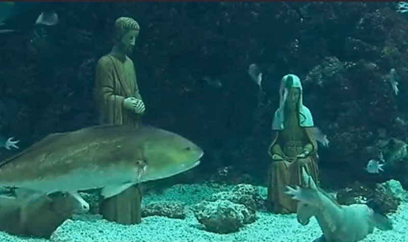 A l’heure du débat sur les crèches de Noël, le musée océanographique de Monaco innove! La principauté monégasque a en effet installé l’une de ses crèches… au milieu des poissons. Le célèbre musée océanographique de Monaco a disposé au fond d’un de ses bassins les figurines de Marie et Joseph entourées du bœuf et de l’âne.