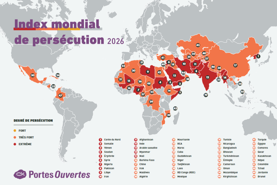La situation des chrétiens persécutés dans le monde est très alarmante, voire a encore empiré, selon l’Index mondial de persécution que vient de publier l’ONG Portes Ouvertes. Pour ce compte rendu annuel de référence, les analystes ont étudié la période allant du 1er octobre 2024 au 30 septembre 2025, et ont mis en lumière une aggravation marquée des violences et discriminations dans plusieurs régions du globe. La Corée du Nord, la Somalie et le Yémen conservent tristement les premières places du classement. Le Nigeria et le Pakistan font également toujours partie des dix pays où les chrétiens souffrent le plus pour leur foi.
